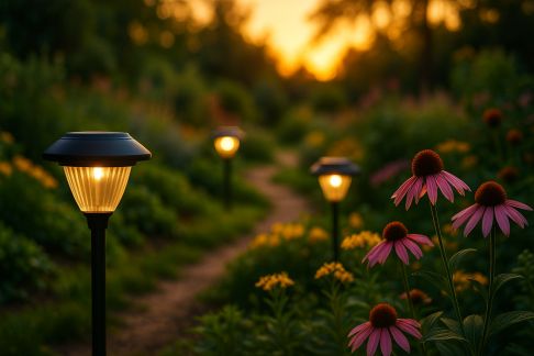 - Intégrez l’éclairage doux : Lanternes à bougie, spots orientés vers une pierre ou une plante phare, LED solaires dissimulées — évitez les lumières trop blanches ou agressives.