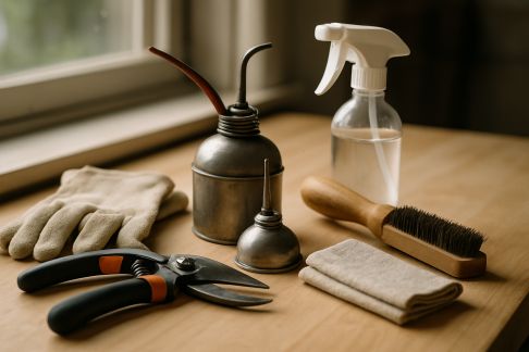 - Nettoyez, huilez et rangez le matériel : râteaux, bêches, pelles, arrosoirs ; vérifiez l’état du tuyau d’arrosage.